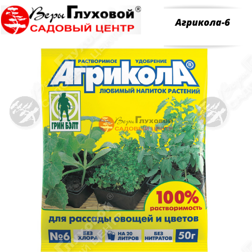 Высокоэффективное водорастворимое комплексное удобрение. Предназначено для полива под корень (корневая подкормка) и опрыскивания (внекорневая подкормка) рассады овощных и цветочных культур. Агрикола-6 усиливает рост рассады и повышает ее устойчивость к заболеваниям и неблагоприятным погодным условиям. Агрикола-6 – экологически чистое удобрение, не содержит хлора и тяжелых металлов.