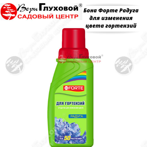 Для изменения цвета гортензий с розового на голубой полив следует осуществлять строго до начала цветения, а затем поддерживать в течение всего периода цветения. Для поддержания насыщенного голубого цвета гортензий применять в течение всего периода цветения. Подкармливать гортензии рекомендуется специализированным удобрением для гортензий Бона Форте. Используя разные сорта и меняя цвет гортензий можно создавать цветные фантазийные клумбы. Способ и нормы применения Средство для изменения цвета гортензий Бона Форте«Радуга», 285 мл В 10-ти литрах воды растворите 1 колпачок (40мл) концентрата «Бона Форте Радуга». Для изменения цвета гортензий с розового на голубой полив следует осуществлять строго до начала цветения, а затем поддерживать в течение всего периода цветения. Для поддержания насыщенного голубого цвета гортензий применять в течение всего периода цветения. Применяют раствор с каждым поливом растений. Норма полива - до увлажнения почвы. Не допускайте попадания раствора на листья и цветки. Допустимо помутнение раствора - это зависит от жесткости используемой воды.