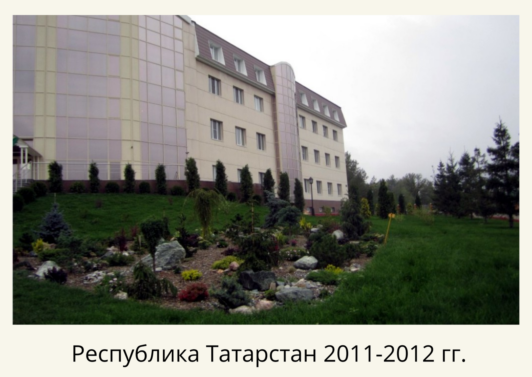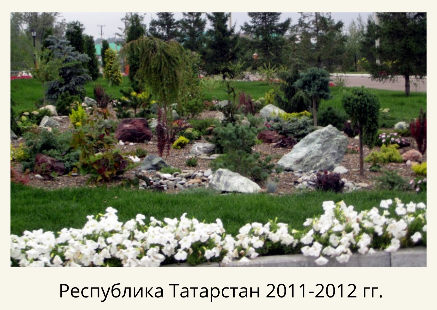 Территории были ухожены, но вместо газона – травяная поросль, цветники переросли, высажено много хвойных растений, но без видимой концепции. Мы постарались исправить данную ситуацию. Удалили сорняки, перекопали, завезли чернозем, постелили рулонный газон и частично отреставрировали существующий на площади 1,5 га. Пересадили и привели в порядок существующие насаждения. Сделали бордюрные цветники с однолетниками (петуния, тагетис, пеларгония, бегония) 10 000шт, рокарии, розарий из бордюрных голландских роз Патио и высадили декоративных хвойных и лиственных растений 1240 шт.